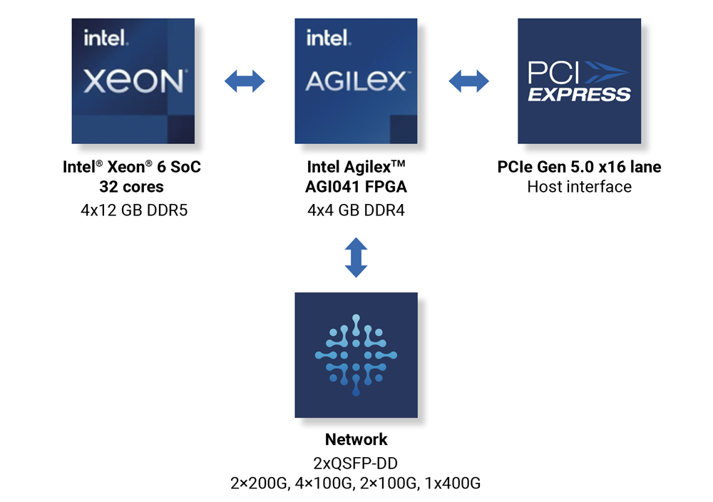 The hardware is complemented with software packages that are fully warranted and supported and leverages an application stack acceleration framework for the easy inclusion of customer-specific logic and workloads. The products also feature an innovative disaggregated design that allows for deployment as a SmartNIC that can be expanded to DPU configurations with the addition of an optional Intel® Xeon® 6 SoC. Disaggregation provides flexible combinations of FPGA and SoC resources that deliver customers the optimal mix of functionality, performance, size, cost, and power, while supported in standard servers from leading manufacturers.