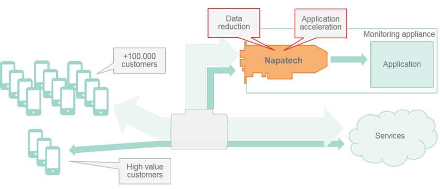 Napatech was engaged by the equipment vendor to help them accelerate and optimize their solution to meet client demands. They needed to enable real-time monitoring and reporting of the prioritized subscriber traffic – providing detailed insights into their mobile network performance, service performance and customer experience. This involved highly advanced analyses – which added severe pressure on the server and degraded the application performance. Analyzing the entire network would involve an overflow of traffic from video streaming, music services, social media, etc. There was a need to reduce the data amount so only traffic from the high-value subscribers could be processed.