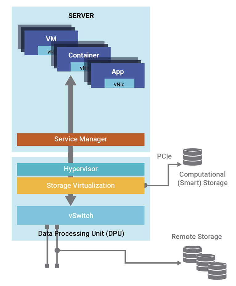 Finally, a significant fraction of the host CPU cores are required for running infrastructure services such as the storage virtualization software, the hypervisor and the vSwitch. This limits the number of CPU cores that can be monetized for Virtual Machines (VMs), containers and applications. Reports indicate that between 30% and 50% of data center CPU resources are typically consumed by infrastructure services.